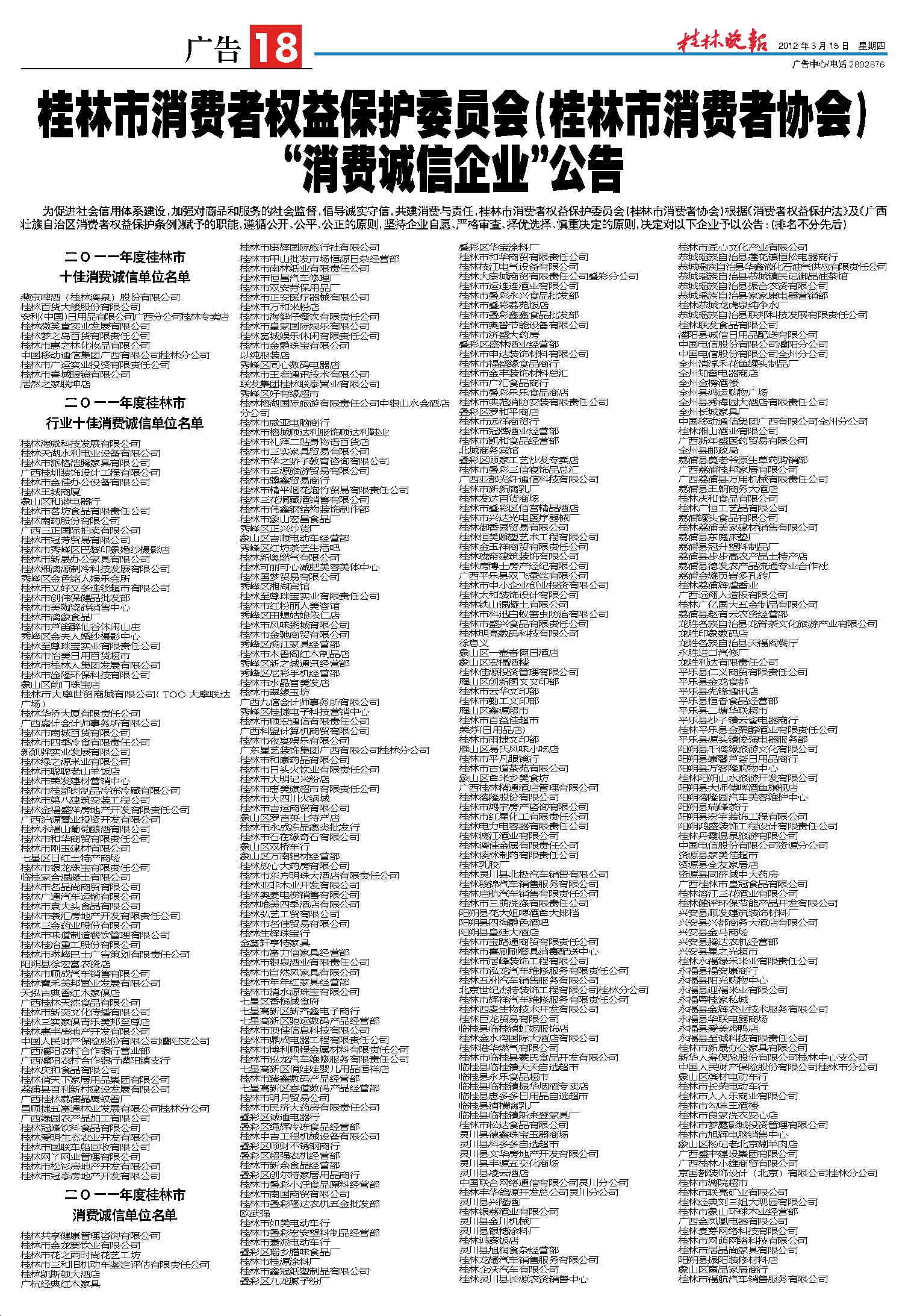 桂林澳林制藥有限責任公司榮獲“2011年度桂林市消費誠信單位”的稱號,刊登在2012年3月15日的桂林晚報上。
