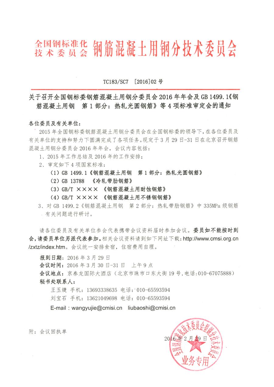 關(guān)于召開鋼標(biāo)委鋼筋混凝土用鋼分委會(huì)2016年年會(huì)及GB1499.1《鋼筋混凝土用鋼 第一部分:熱軋光圓鋼筋》等4項(xiàng)標(biāo)準(zhǔn)審定會(huì)的通知